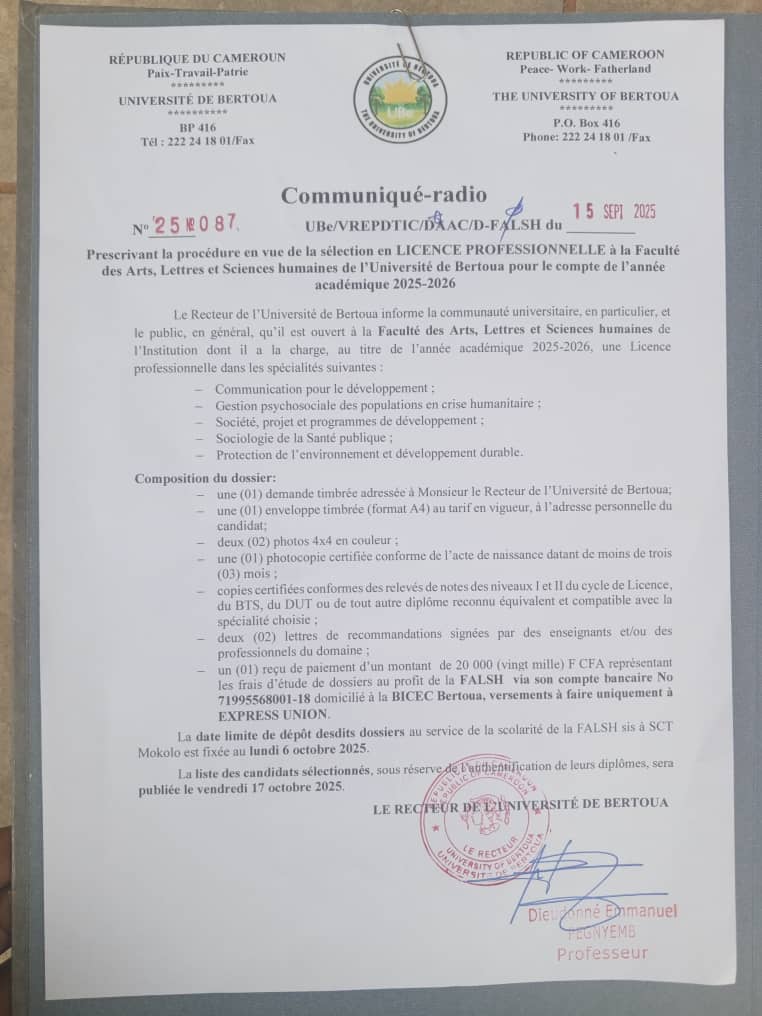 Le communiqué de Monsieur le Recteur de l'Université de Bertoua prescrivant la procédure de sélection en Licence professionnelle à la Faculté des Arts Lettres et Sciences Humaines.