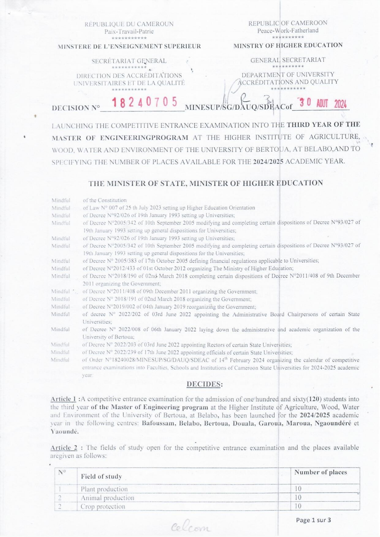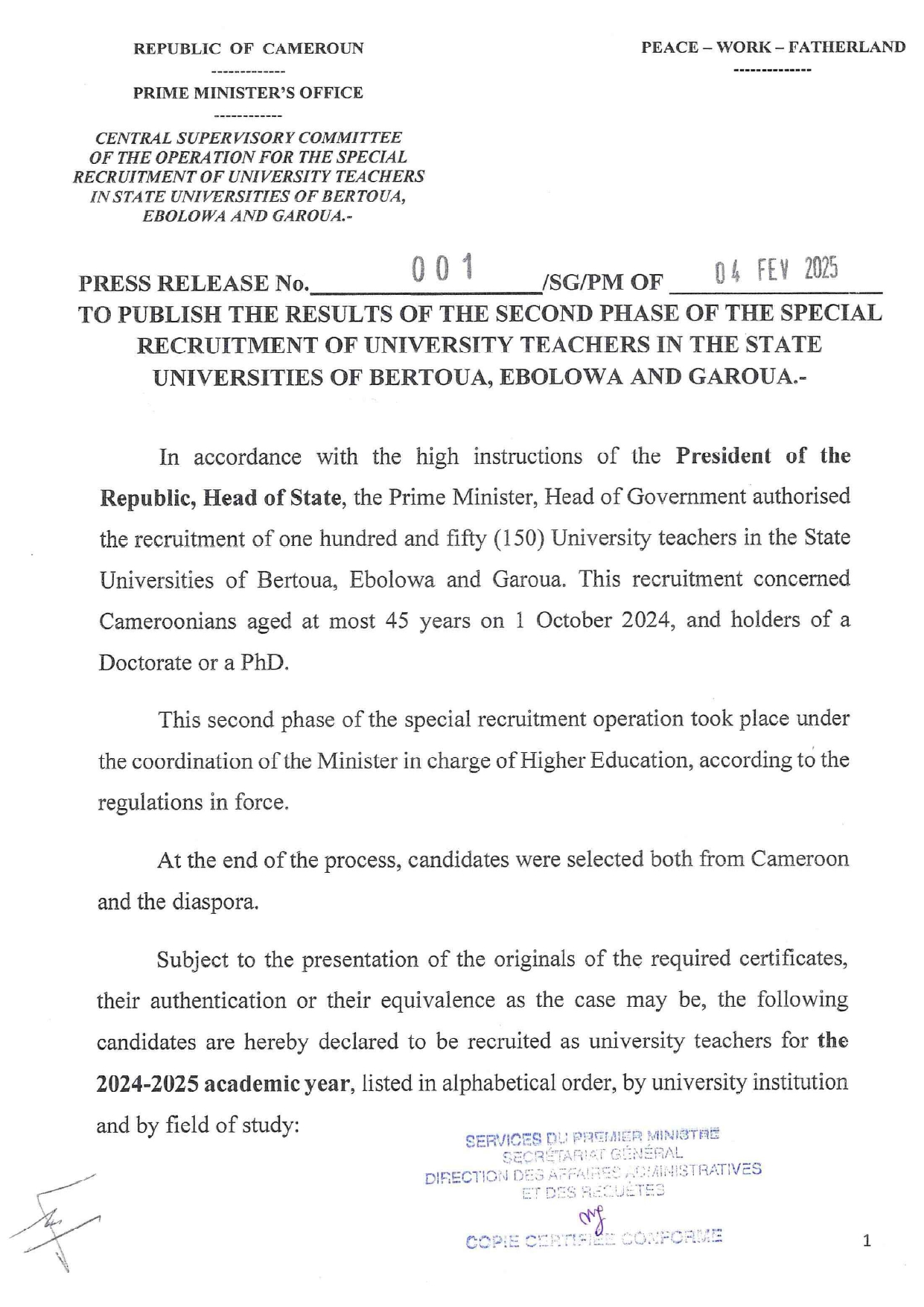 Results of the second phase of de spécial recrutement of teatchers in the state Universities of Bertoua, Ebolowa and Garoua CUTI 2025-02-05